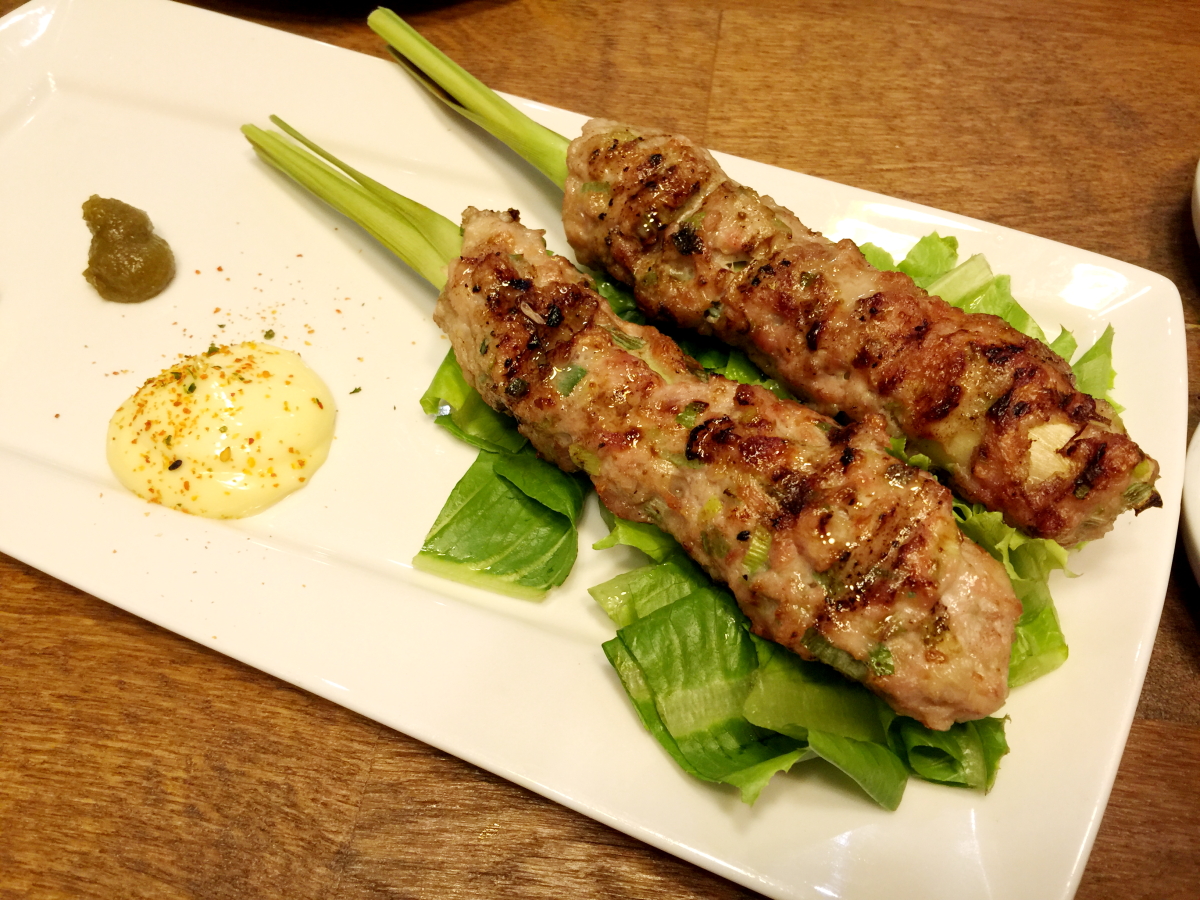 ※雞肉串烤chicken meatball on a skewer,這個特別的地方在,是將雞肉泥