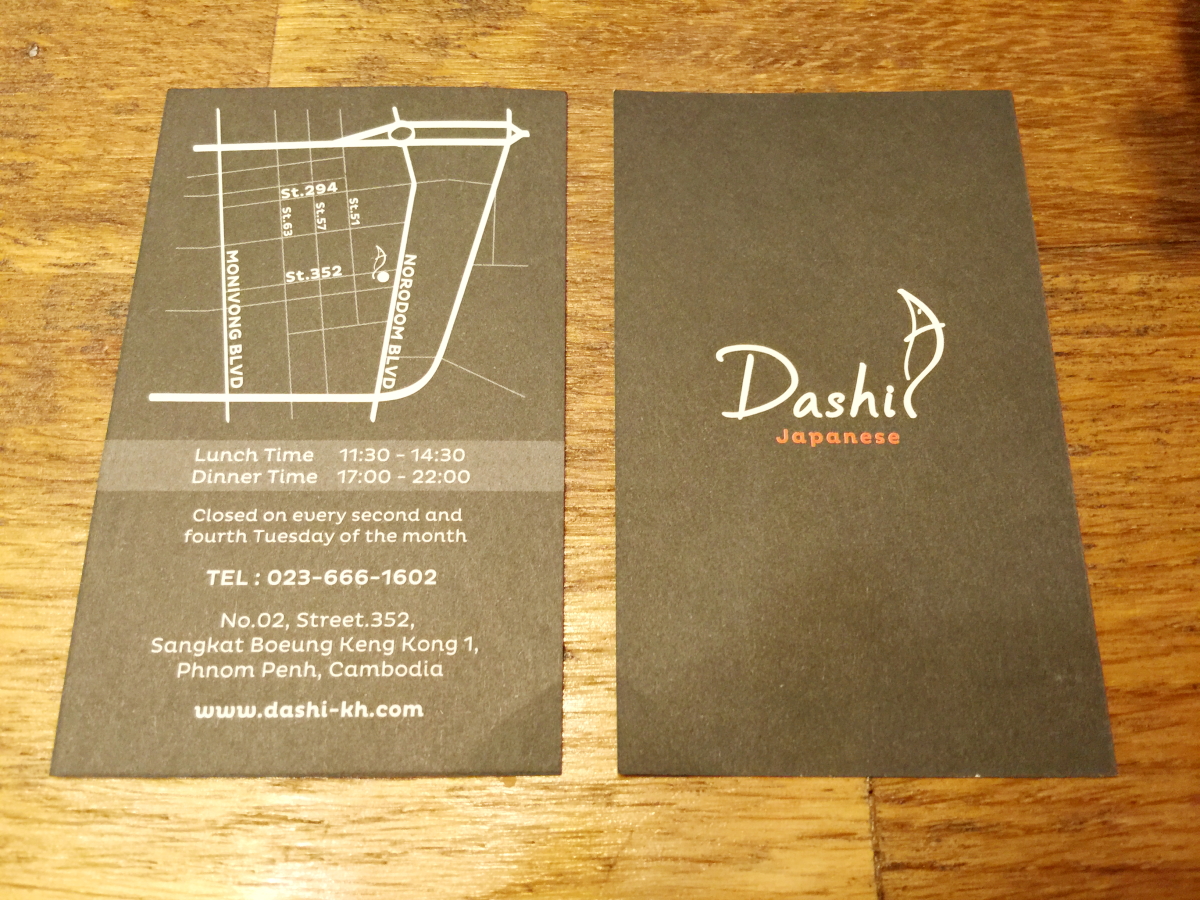 店名:Dashi地址:No.02, Street.352, Sangkat Boeung Keng Kong 1, Khan Chamkamon, Phnom Penh, Cambodia網址:http://www.dashi-kh.com/