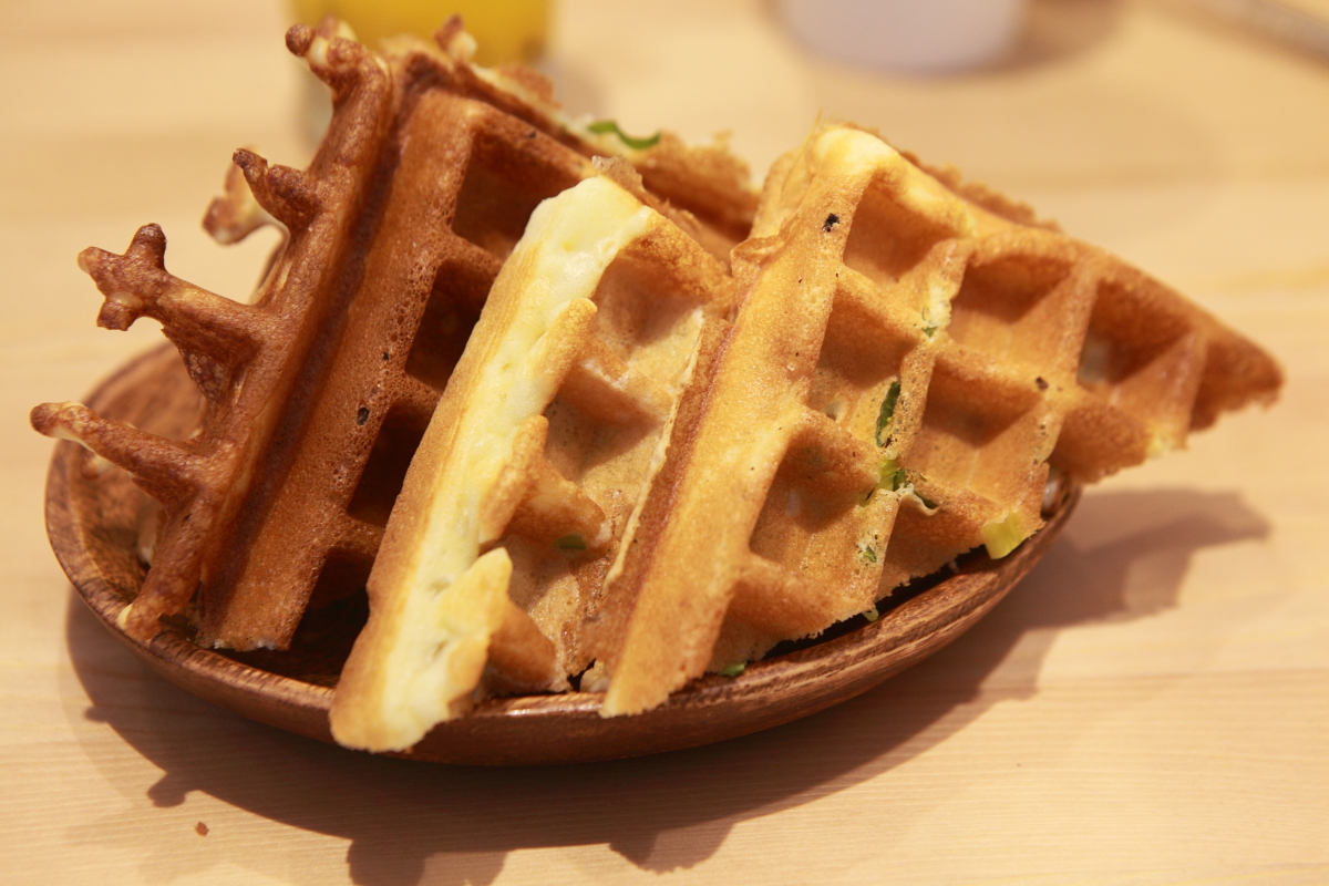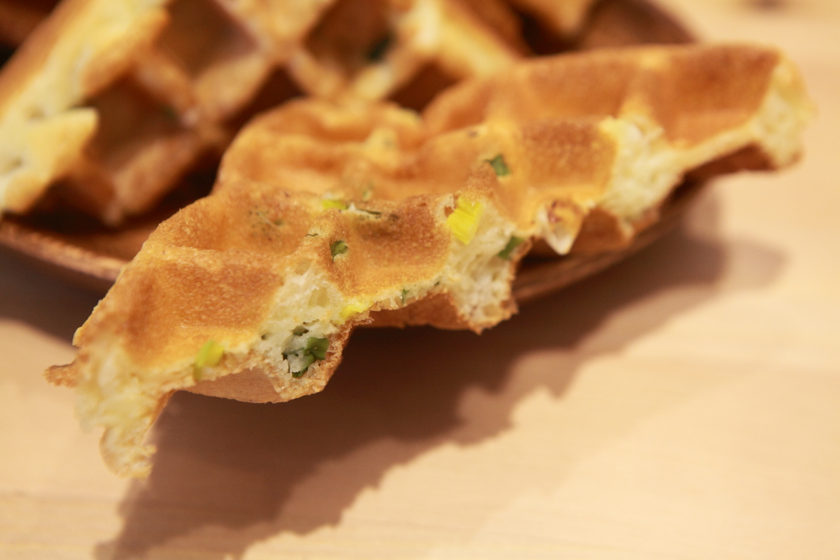 好特別的蔥味鬆餅,第一次看過、第一次吃過,連同蔥一起加入鬆餅內烤,