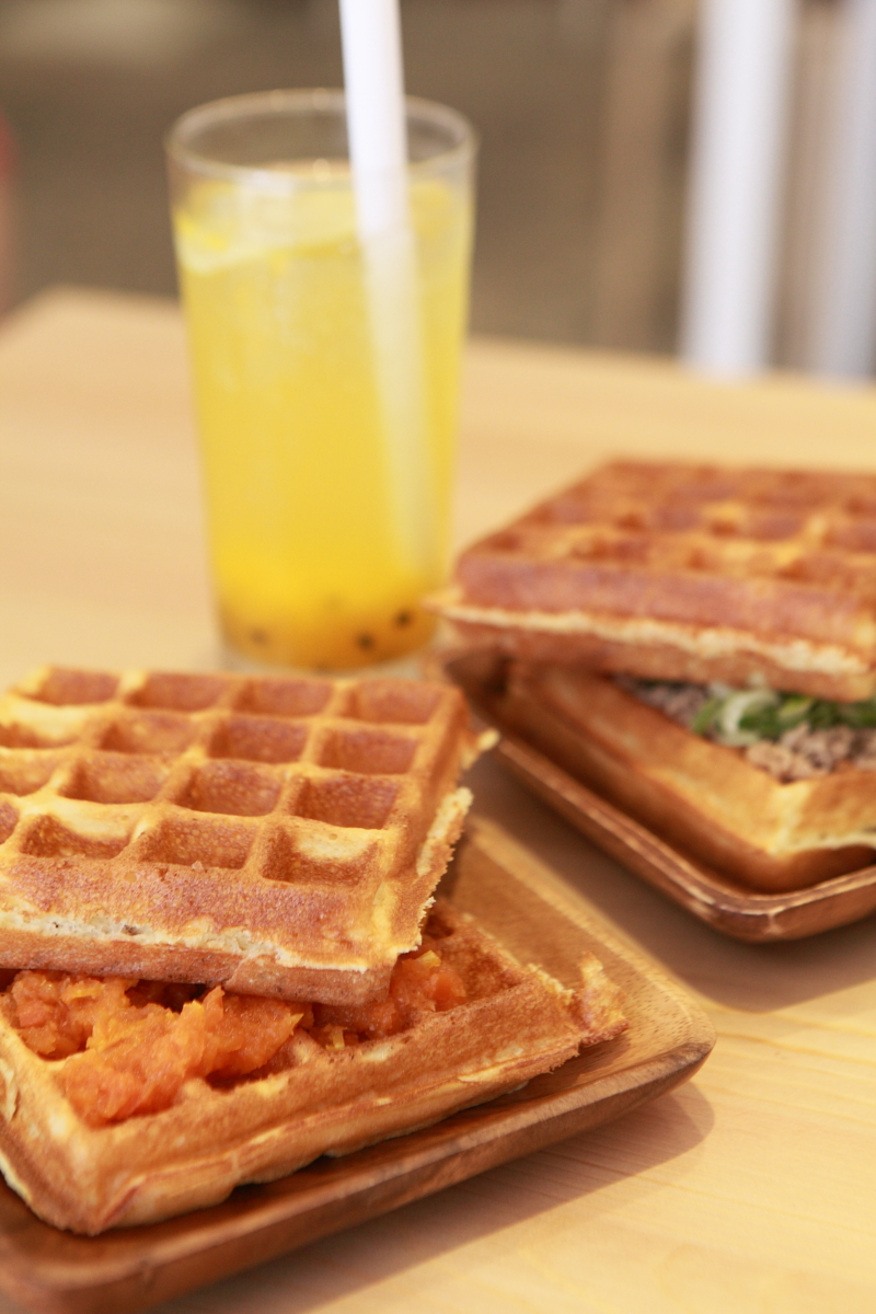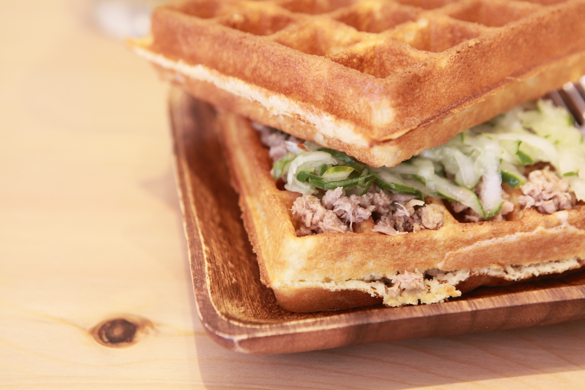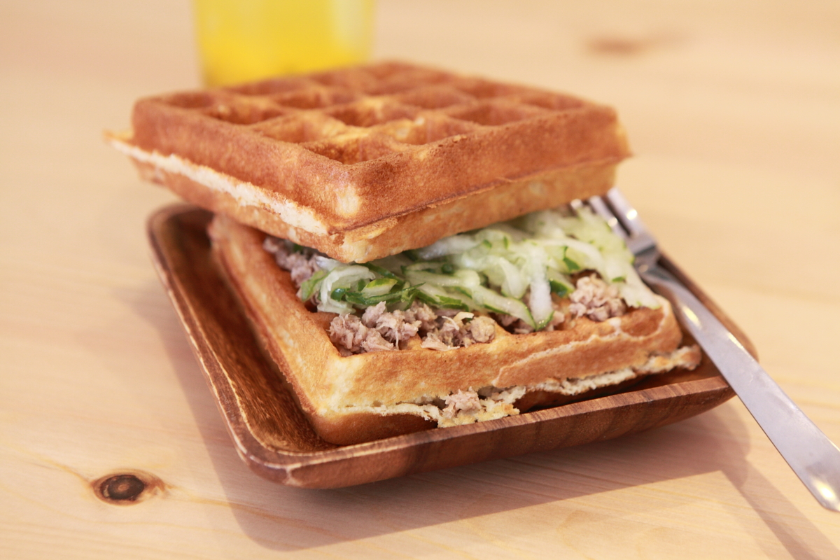 老闆用料頗大方,不馬虎,四方的鬆餅上,滿滿的鮪魚跟清爽的小黃瓜,